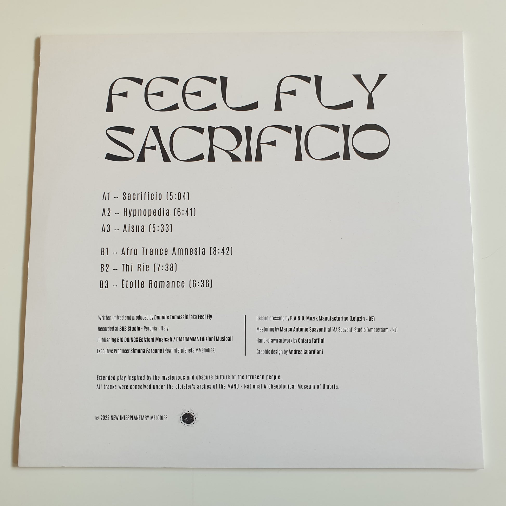 "The title track, Sacrificio (A1) opens the album with an ecstatic drum-break on which powerful subs stand out, catapulting you directly into the obscure rituals of the haruspices, intent on interpreting the signs of the divine, with the help of mysterious pads and shimmering synths like fires in the night.